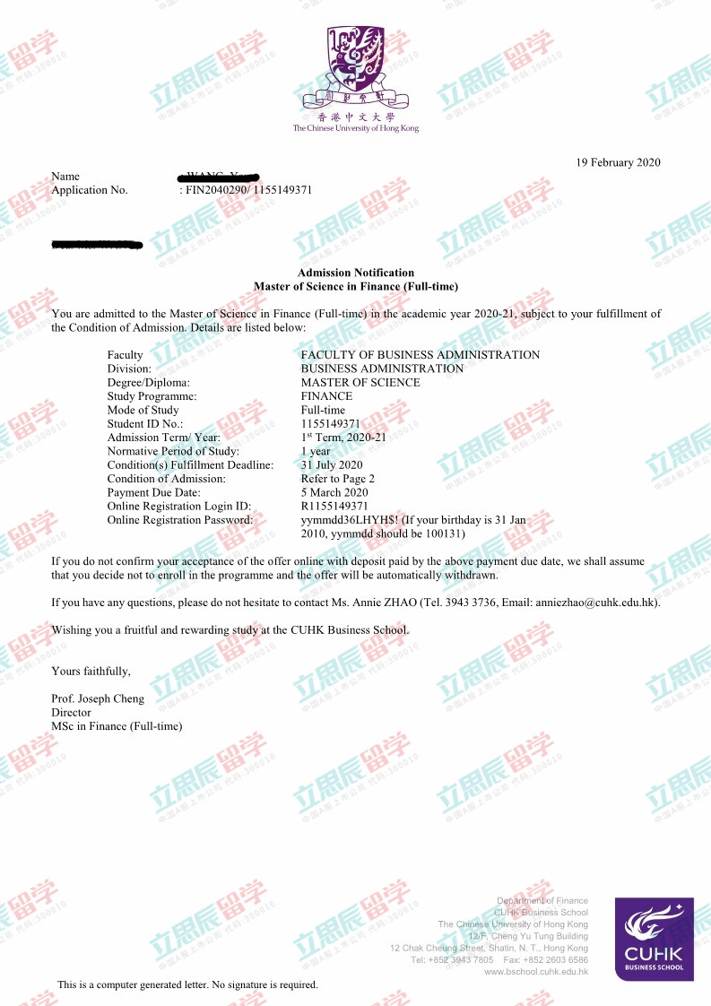 录取院校:香港中文大学